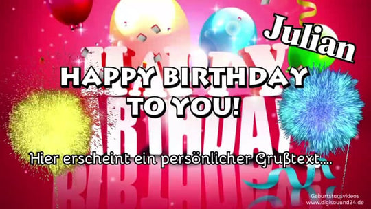 Geburtstagsvideo mit Namen und persönlichen Grußtext. Name und Gruß-Text erscheinen im Video. (Name wird nicht gesungen) Wunschnamen (Namen, Kosenamen,Spitznamen usw…) angeben und ein persönliches Geburtstagsvideo erhalten dass Sie beliebig vom Handy, PC, Tablet usw... versenden können. Kurzen Geburtstagsgruß angeben,...Regulärer Preis €16,90Regulärer Preis €16,90 -